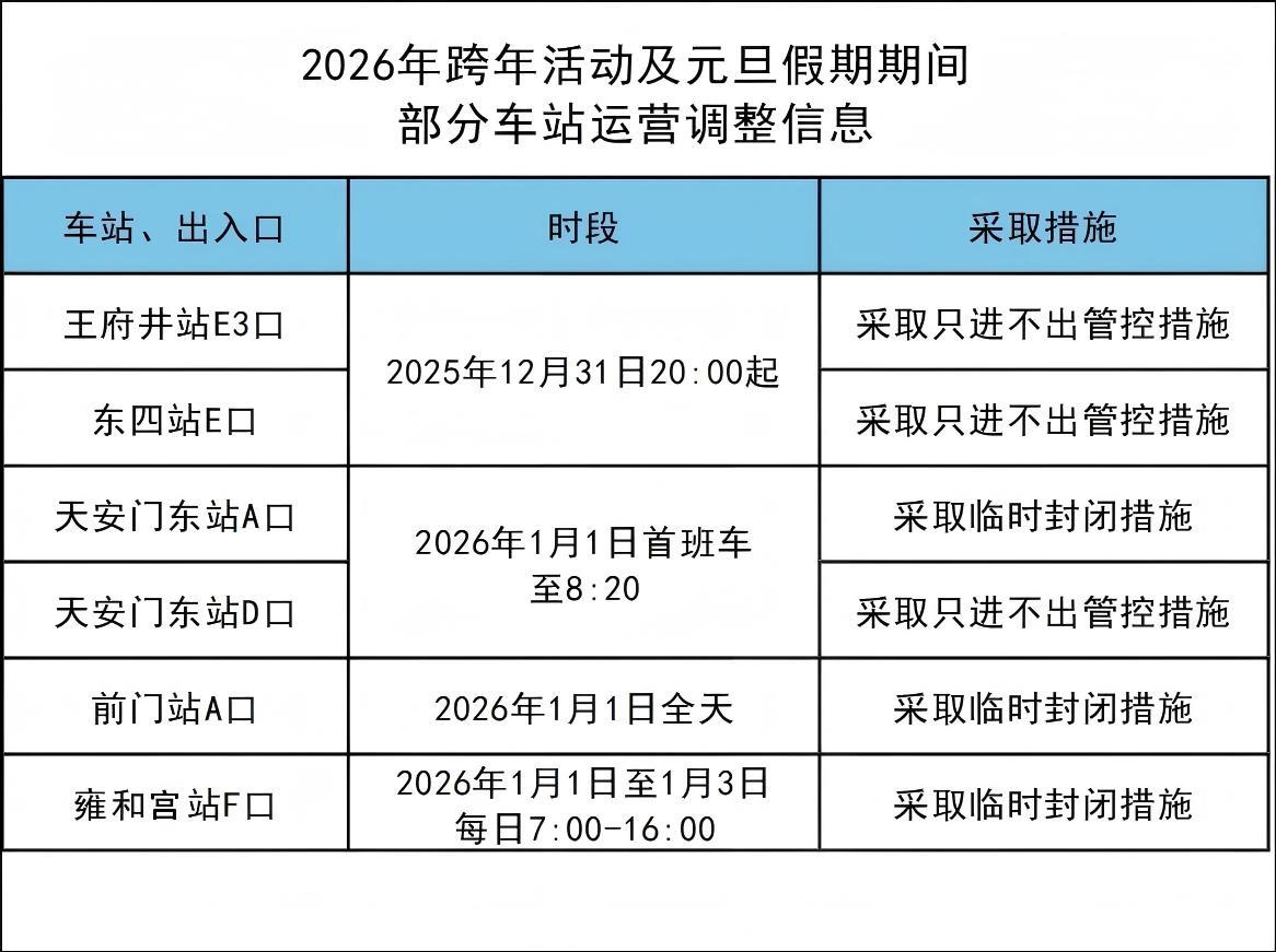 为满足2026年跨年活动及元旦假期期间乘客出行需求,确保乘客平安、顺畅出行云上速配,北京地铁公司密切关注旅游景点、商圈等周边车站客流情况,对部分线路车站采取“分时段”运营调整措施,请乘客提前安排出行计划。详情如下: